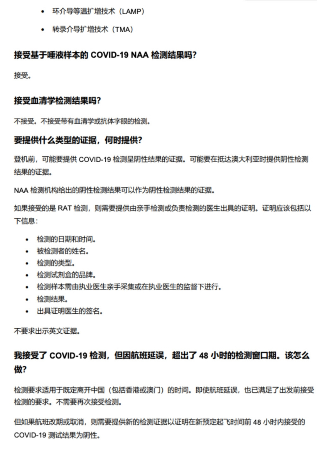 旅客须在离开中国(包括香港或澳门)前 48 小时内接受快速抗原检测(RAT)或任何类型的核酸扩增检测(NAAT),且检测结果须呈阴性。